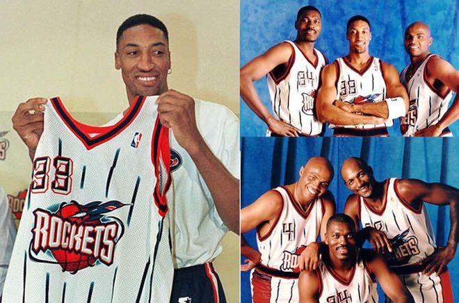 再来说说乔丹最佳搭档,也就是“皮二爷”斯科蒂·皮蓬,由于在1997年的夏天,球队想要将他作为筹码,来换取新秀特雷西·麦克格雷迪,皮蓬非常的愤怒,再加上此前一直拿着“童工合同”,所以他已经急不可耐离开芝加哥了。之后,劳资纠纷的爆发,给到了皮蓬机会,在33岁的年纪他拿到了生涯的第一份,同时也是最后一份大合同5年7736万美元。成功离开了是非之地,加盟了拥有哈基姆·奥拉朱旺、查尔斯·巴克利的火箭队,组成了老年三巨头。