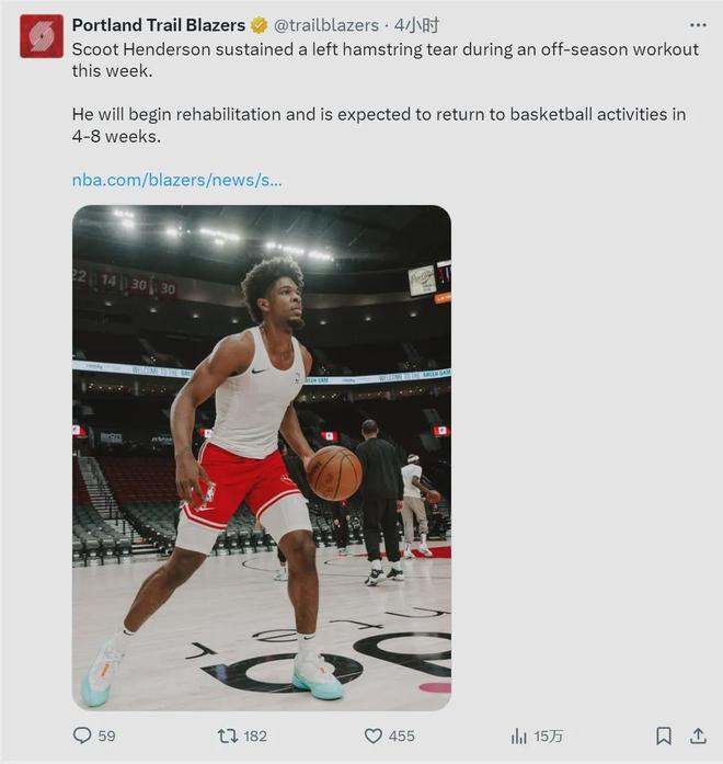 开拓者今天官宣,前NBA探花秀斯库特·亨德森在季前训练中遭遇了左腿筋撕裂,需要立即开始康复治疗。