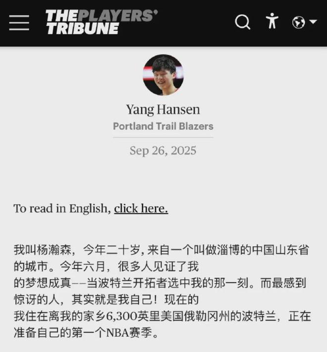 今天,杨瀚森在体育媒体平台The Players’Tribune上写了一封亲笔信,向海外的新朋友讲述自己的成长历程。