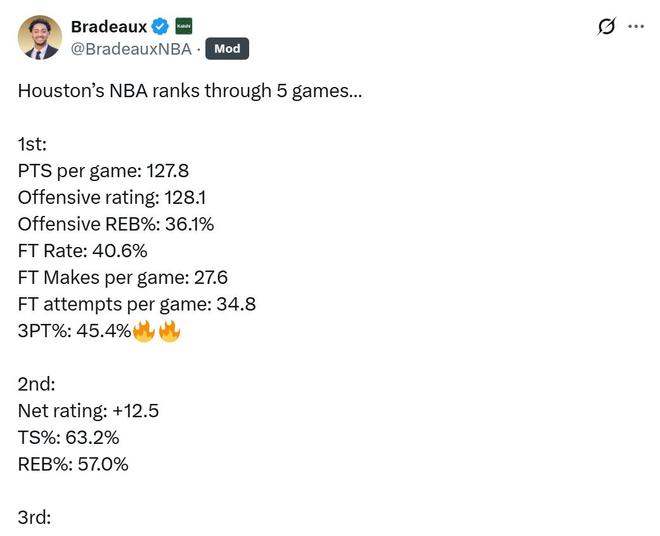 此役之后,火箭有多达8项数据高居联盟第1数据显示,火箭队的场均得分(127.8)、进攻效率(128.1)、进攻篮板率(36.1%)、罚球率(40.6%)、场均罚球命中数(27.6)、场均罚球出手数(34.8)、三分命中率(45.4%),7项数据都领跑联盟。此外,马刺不敌太阳后,休斯顿的净效率(每百回合净胜分)来到了联盟第一(+12.5)。