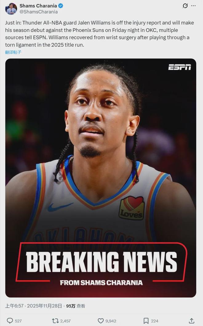 今天,NBA知名记者Shams透露,雷霆确定可以在明天对阵太阳的比赛里迎来杰威的复出。
