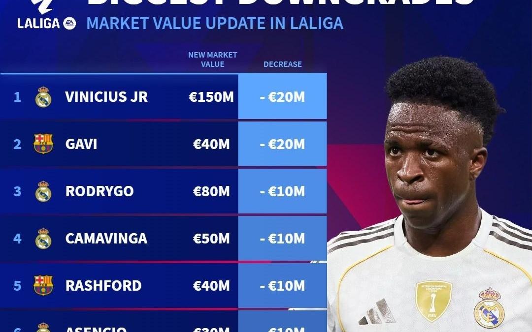 西甲身价下跌榜TOP10:维尼修斯、加维跌2000万欧最多