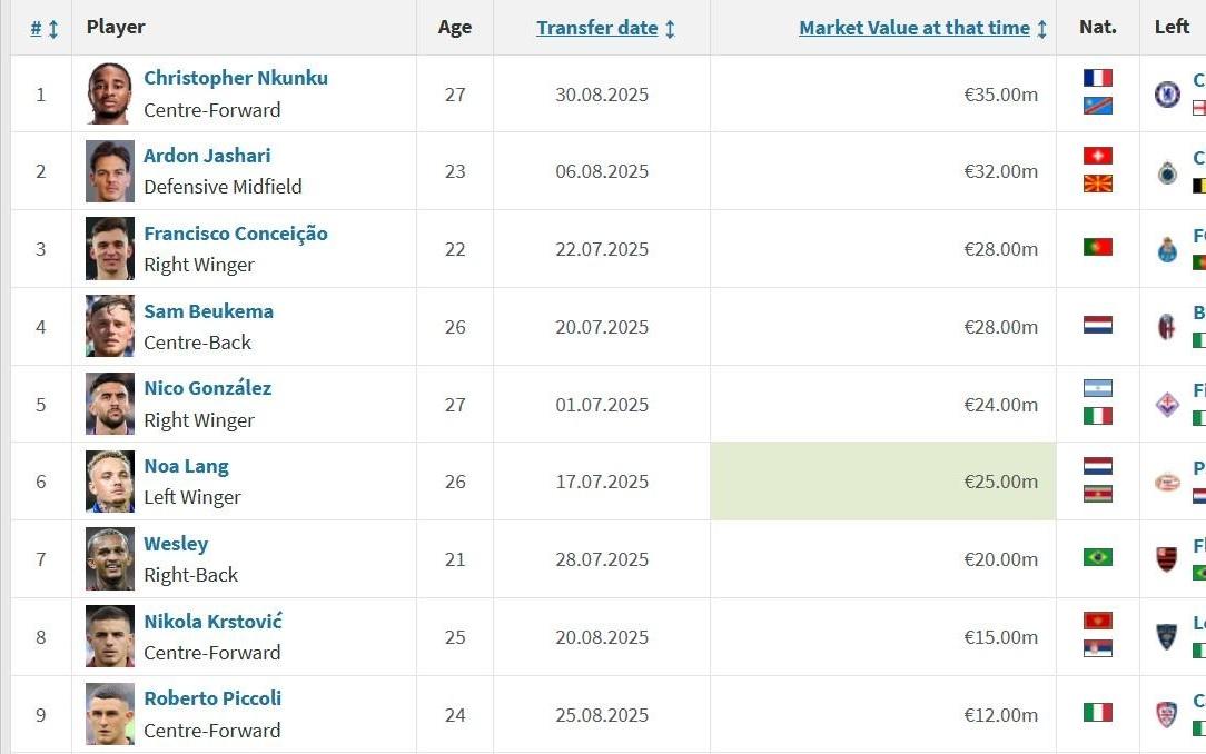 意甲夏窗引援TOP10:恩昆库3700万欧标王,亚沙里3600万欧第2