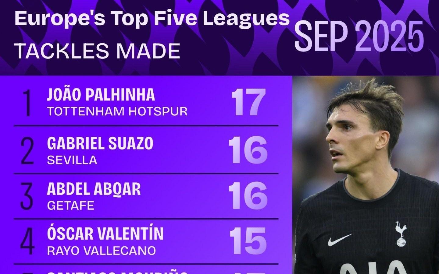 五大联赛九月份铲球榜:帕利尼亚17次居首,苏亚索16次第二