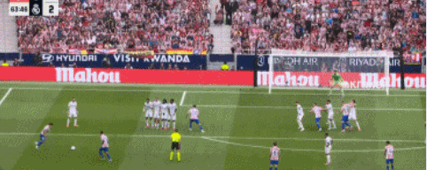 第63分钟,阿尔瓦雷斯站在禁区外围,面对皇马组成的人墙,主罚任意球直接破门,皮球越过人墙钻入球网,帮助马竞4-2扩大领先优势,现场7万主队球迷陷入了沸腾。