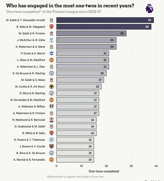 最佳搭档:自2018-19赛季以来,两对搭档遥遥领先:萨拉赫与阿诺德(39次),萨卡与厄德高(38次)。