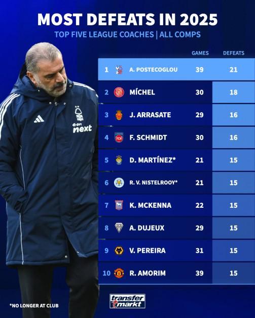 北京时间10月9日,德转统计出了欧洲五大联赛2025年各项赛事输球场次最多10位主教练,上个月接手诺丁汉森林之后1平3负的波斯特科格鲁排名第一,曼联主帅阿莫林同样上榜。