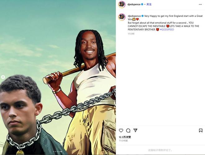 比赛结束后,斯彭斯在社交媒体上发表动态,并配文:“非常高兴在英格兰队首次首发并取得一场精彩的胜利♥️。但先把这些情感放在一边……你无法逃避不可避免的事情,兄弟,让我们去牢里走一趟吧。”