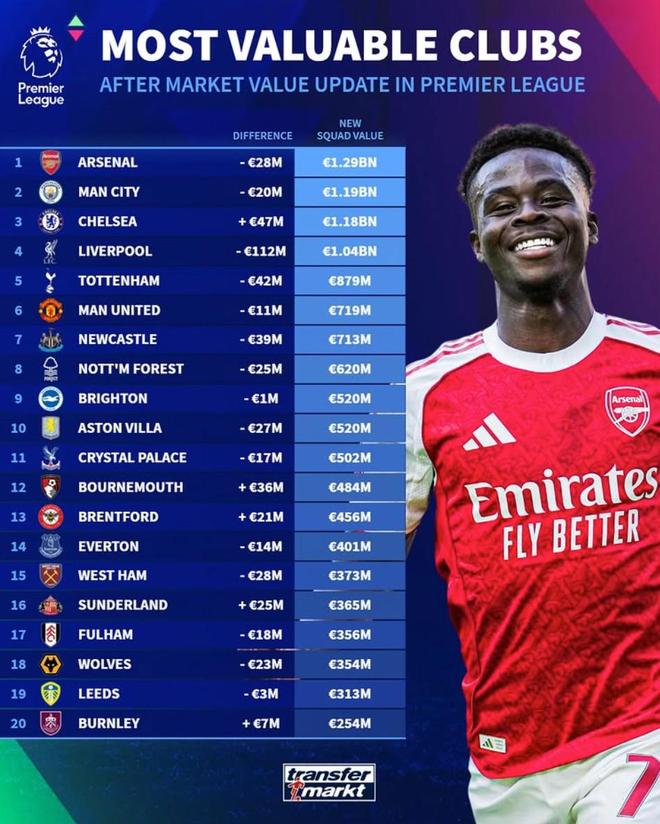 1. 阿森纳 12.9亿欧元(-2800万欧元)